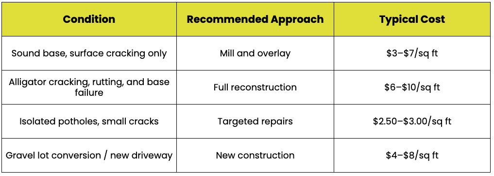 If your lot shows widespread alligator cracking, major rutting, or standing water, those indicate base failure. A full rebuild with a new base may cost more upfront, but it prevents paying twice within a few winters when the overlay fails prematurely.