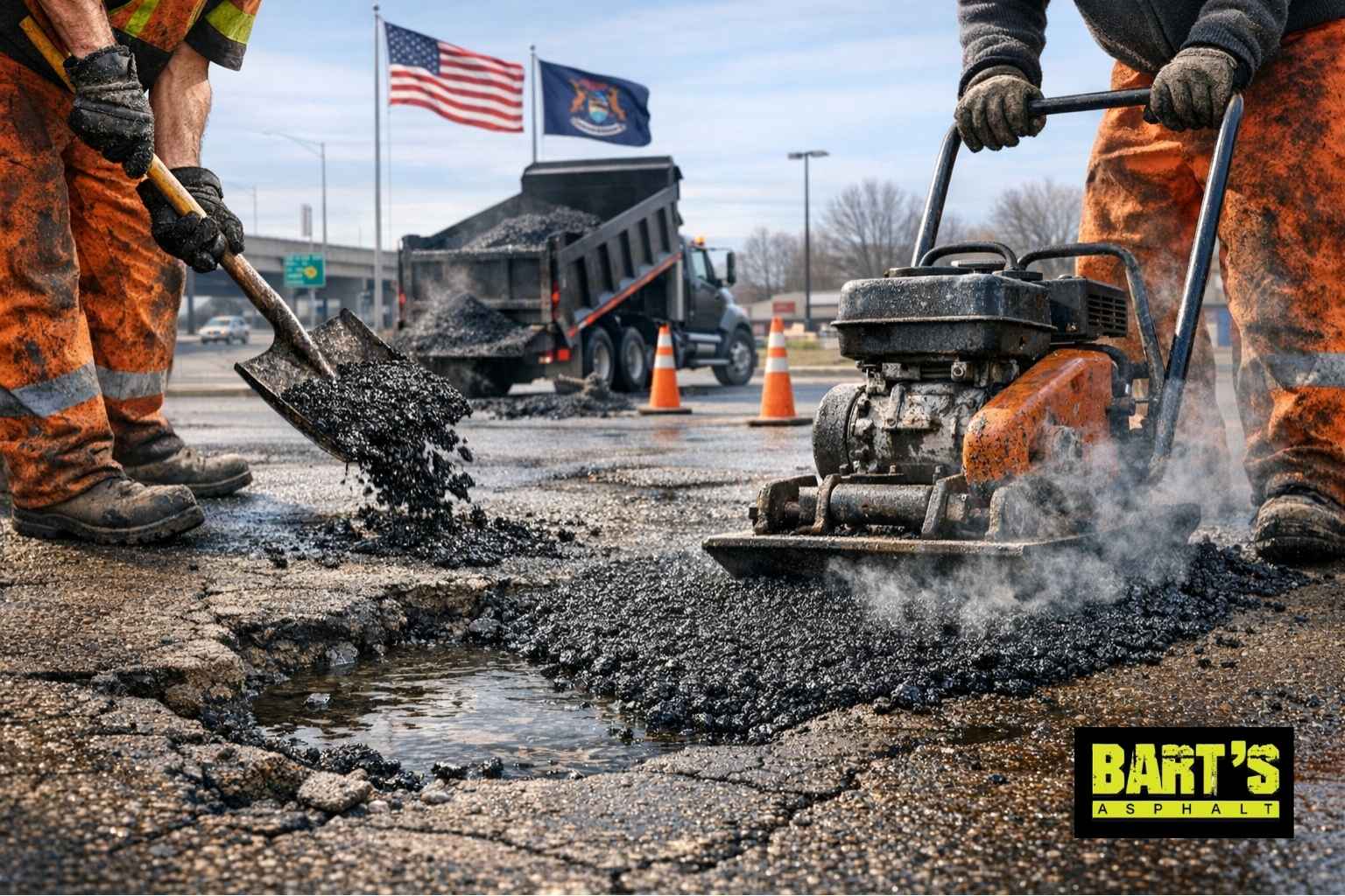 For chronic wet areas, underdrains or regrading toward a catch basin prevents the saturated base conditions that cause repeat failures. A solid, well-compacted base — compacted to 95% density per MDOT specifications — is the single biggest difference between a patch that survives five winters and one that fails after the first thaw.