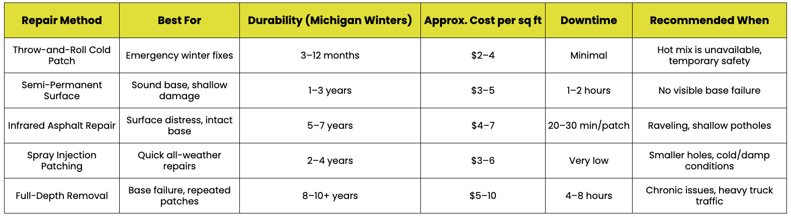 Michigan commercial properties typically choose from five repair approaches — throw-and-roll cold patch, semi-permanent surface patching, infrared repair, spray injection, and full-depth removal — ranging from $2 per square foot for temporary fixes lasting 3–12 months to $10 per square foot for permanent repairs lasting a decade or more.
